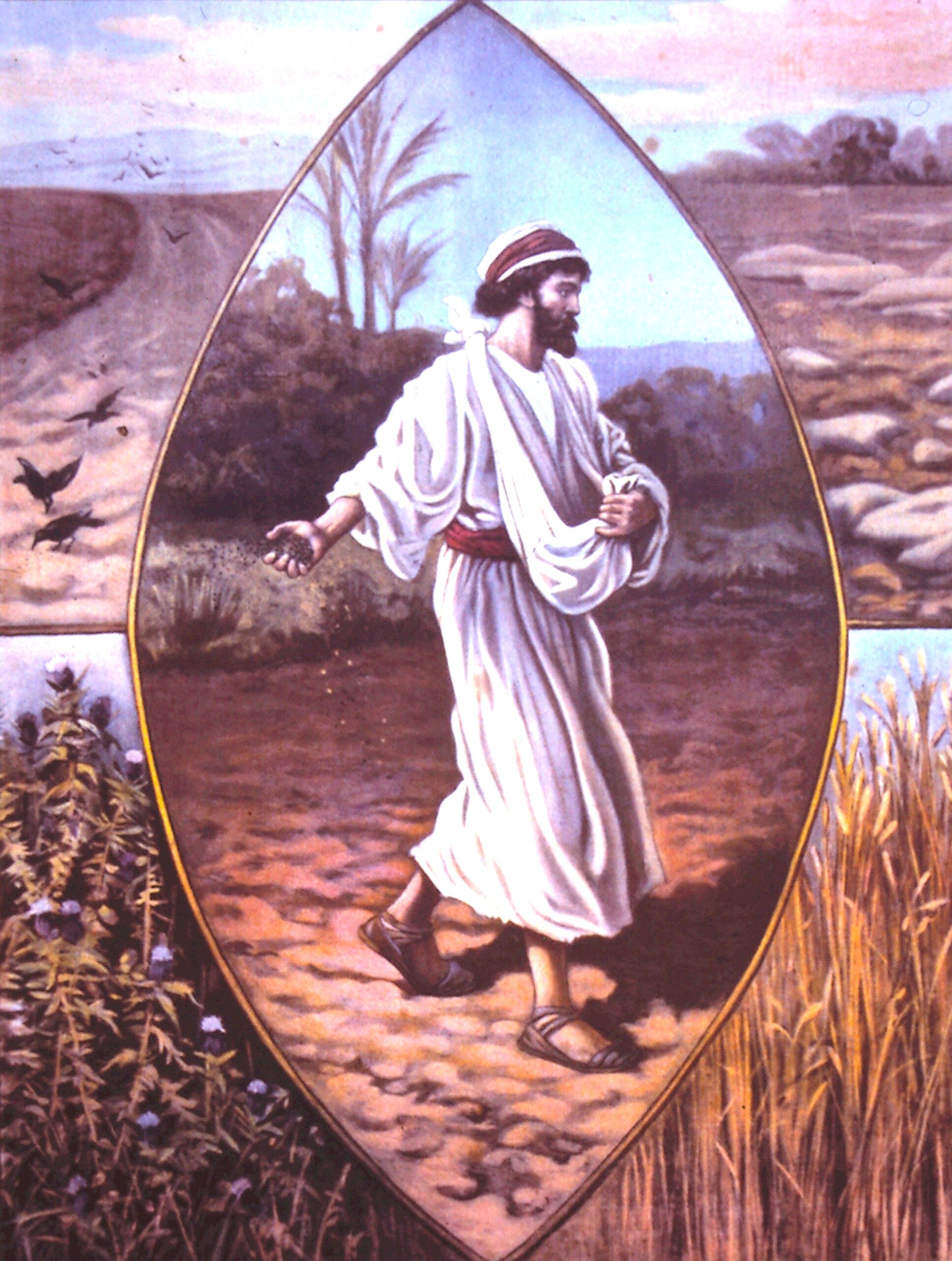 - Manches fällt auf den Weg. Dort werden die Samen werden von Vögeln aufgefressen. So gibt es keine Chance auf eine Ernte. — Gemeint sind hier Menschen, die das Evangelium wohl hören, es aber nicht an sich heranlassen. Es geht gleich wieder vergessen. Dazu mag der Stress des Alltags beitragen. Es mögen Ablenkungen mitspielen. Es gibt ‘Gegen-Botschaften’ (Mk 4,15 spricht sogar davon, dass der Satan die Körner wieder wegnehme). Dennoch sät der Bauer auch auf den Weg. Er lässt sich vom hohen Risiko auf dem festgetretenen, harten Boden weder entmutigen noch abhalten. Es könnte doch sein, dass das eine oder andere Samenkorn von den Vögeln übersehen wird.